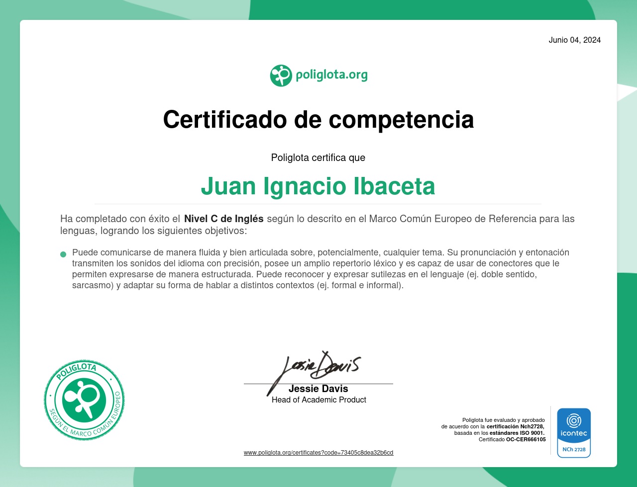 Completó con éxito el curso de nivel C de inglés, puede comunicarse de manera fluida y bien articulada sobre, potencialmente, cualquier tema. su pronunciación y entonación transmiten los sonidos del idioma con precisión, posee un amplio repertorio léxico y es capaz de usar de conectores que le permiten expresarse de manera estructurada. puede reconocer y expresar sutilezas en el lenguaje (ej. doble sentido, sarcasmo) y adaptar su forma de hablar a distintos contextos (ej. formal e informal). ¿Quieres aprender un nuevo idioma? Haz como Juan y comienza a estudiar ahora con Poliglota. ¡Ven a conocer nuestra metodologia social!.