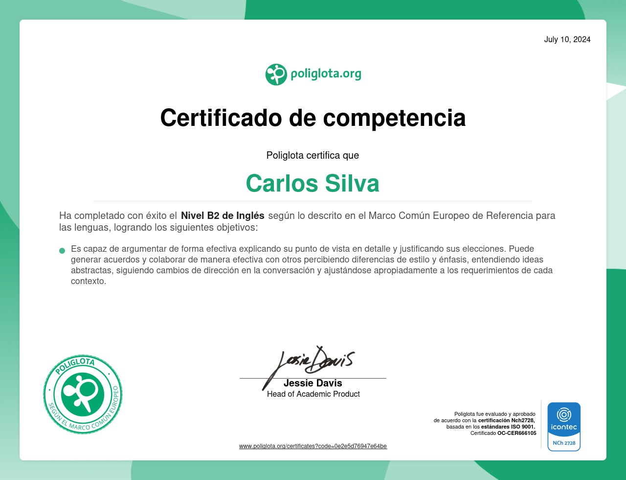 Completó con éxito el curso de nivel B2 de inglés, es capaz de argumentar de forma efectiva explicando su punto de vista en detalle y justificando sus elecciones. puede generar acuerdos y colaborar de manera efectiva con otros percibiendo diferencias de estilo y énfasis, entendiendo ideas abstractas, siguiendo cambios de dirección en la conversación y ajustándose apropiadamente a los requerimientos de cada contexto.