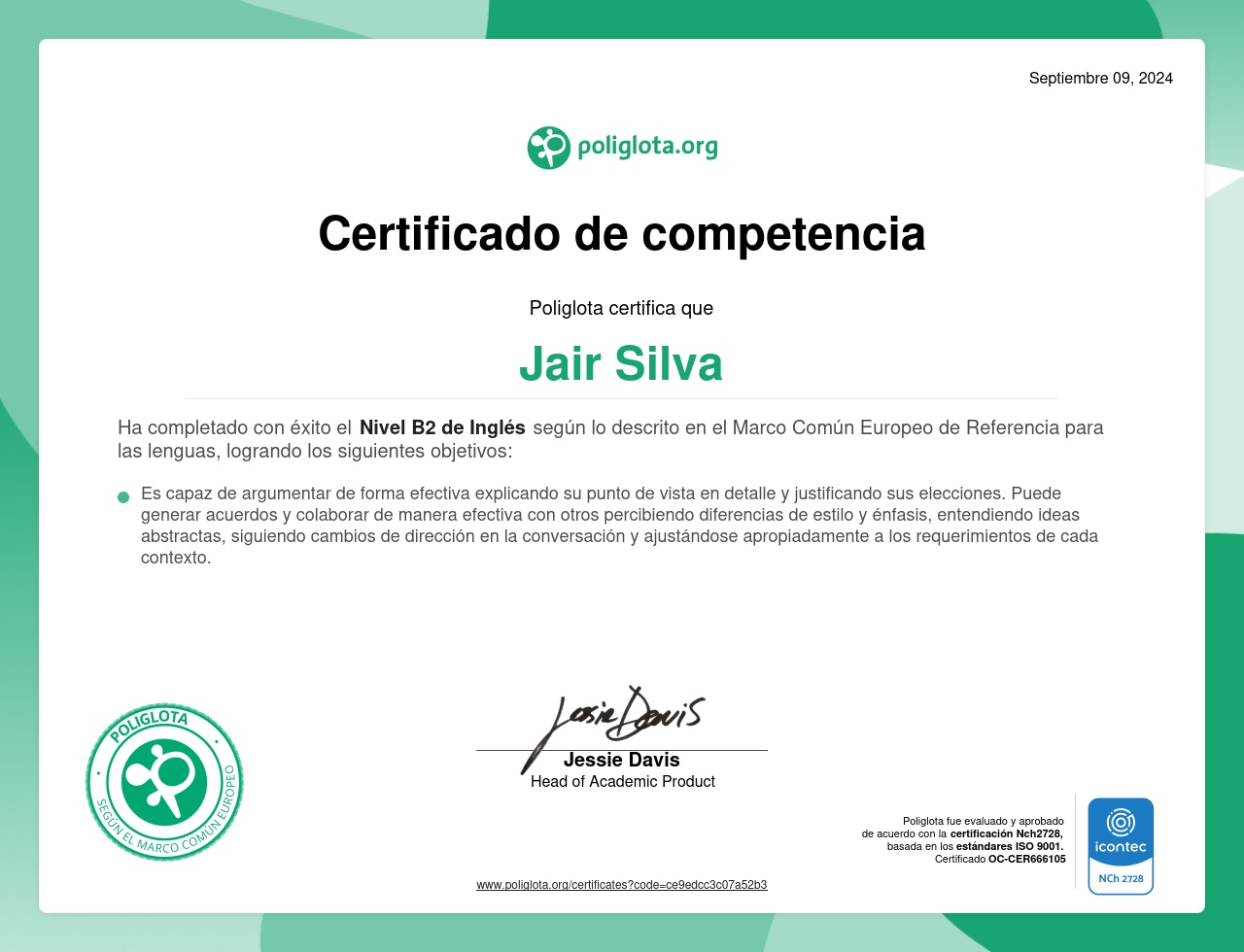 Completó con éxito el curso de nivel B2 de inglés, es capaz de argumentar de forma efectiva explicando su punto de vista en detalle y justificando sus elecciones. puede generar acuerdos y colaborar de manera efectiva con otros percibiendo diferencias de estilo y énfasis, entendiendo ideas abstractas, siguiendo cambios de dirección en la conversación y ajustándose apropiadamente a los requerimientos de cada contexto. ¿Quieres aprender un nuevo idioma? Haz como Jair y comienza a estudiar ahora con Poliglota. ¡Ven a conocer nuestra metodologia social!.