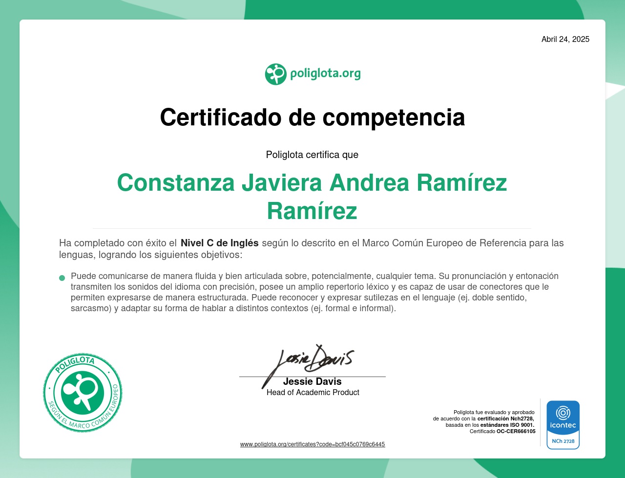 Completó con éxito el curso de nivel C de inglés, puede comunicarse de manera fluida y bien articulada sobre, potencialmente, cualquier tema. su pronunciación y entonación transmiten los sonidos del idioma con precisión, posee un amplio repertorio léxico y es capaz de usar de conectores que le permiten expresarse de manera estructurada. puede reconocer y expresar sutilezas en el lenguaje (ej. doble sentido, sarcasmo) y adaptar su forma de hablar a distintos contextos (ej. formal e informal).
