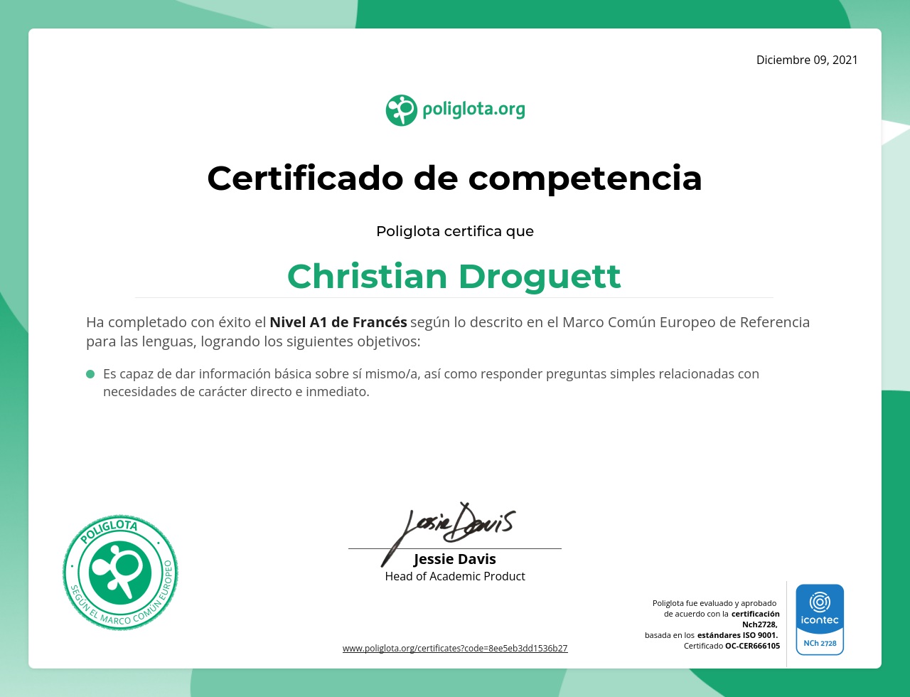 Completó con éxito el curso de nivel A1 de francés, es capaz de dar información básica sobre sí mismo/a, así como responder preguntas simples relacionadas con necesidades de carácter directo e inmediato.