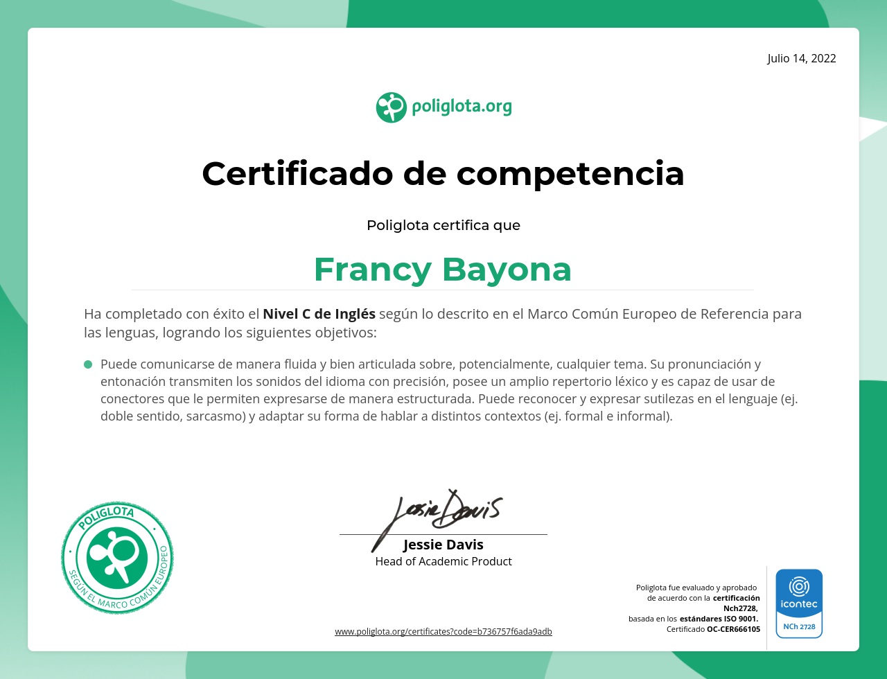 Completó con éxito el curso de nivel C de inglés, puede comunicarse de manera fluida y bien articulada sobre, potencialmente, cualquier tema. su pronunciación y entonación transmiten los sonidos del idioma con precisión, posee un amplio repertorio léxico y es capaz de usar de conectores que le permiten expresarse de manera estructurada. puede reconocer y expresar sutilezas en el lenguaje (ej. doble sentido, sarcasmo) y adaptar su forma de hablar a distintos contextos (ej. formal e informal). ¿Quieres aprender un nuevo idioma? Haz como Francy y comienza a estudiar ahora con Poliglota. ¡Ven a conocer nuestra metodologia social!.