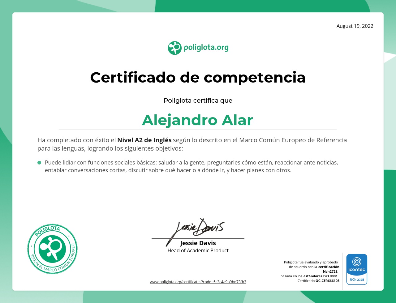 Completó con éxito el curso de nivel A2 de inglés, puede lidiar con funciones sociales básicas: saludar a la gente, preguntarles cómo están, reaccionar ante noticias, entablar conversaciones cortas, discutir sobre qué hacer o a dónde ir, y hacer planes con otros. ¿Quieres aprender un nuevo idioma? Haz como Alejandro y comienza a estudiar ahora con Poliglota. ¡Ven a conocer nuestra metodologia social!.