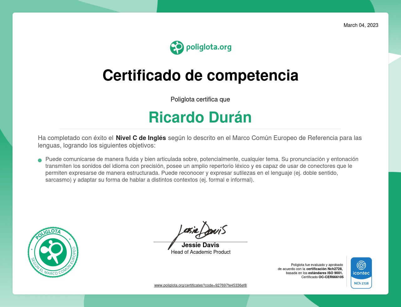 Completó con éxito el curso de nivel C de inglés, puede comunicarse de manera fluida y bien articulada sobre, potencialmente, cualquier tema. su pronunciación y entonación transmiten los sonidos del idioma con precisión, posee un amplio repertorio léxico y es capaz de usar de conectores que le permiten expresarse de manera estructurada. puede reconocer y expresar sutilezas en el lenguaje (ej. doble sentido, sarcasmo) y adaptar su forma de hablar a distintos contextos (ej. formal e informal).